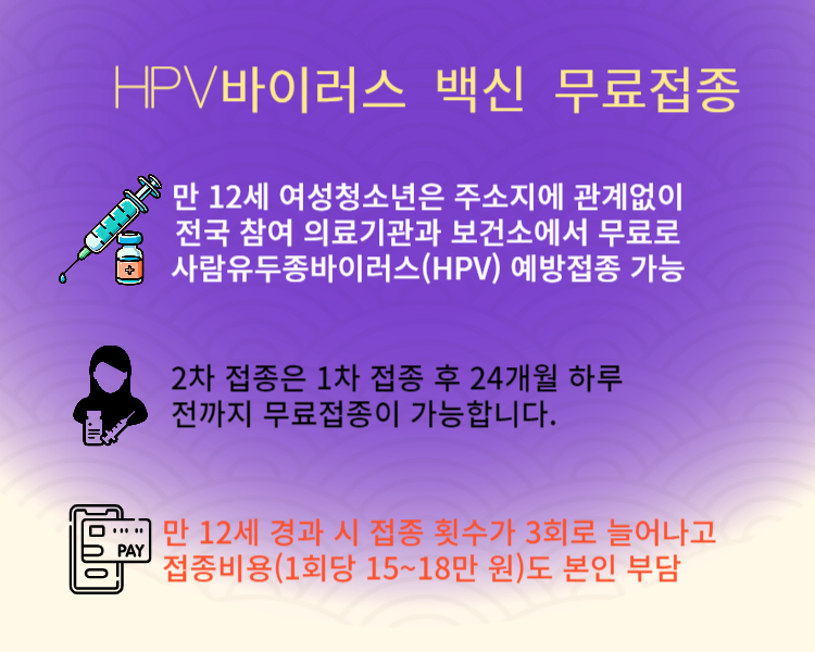 자궁경부암 예방접종 최적의 나이는 15~17세입니다. 그러나 이 시기가 지났더라도 26세 이전에 자궁경부암 예방접종을 받으면 그 효력이 유효합니다. 우리나라는 2016년부터 국가 필수예방접종에 포함되어 만 12세 여성청소년에게 무료로 자궁경부암 예방접종을 시행하고 있습니다.